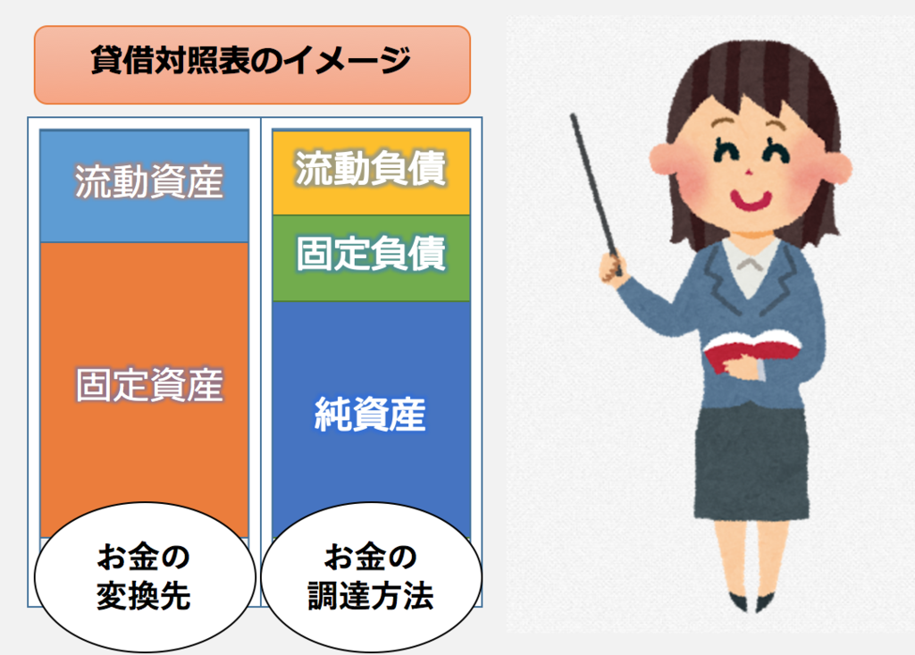 ⇨借りたお金、株主からの出資金、企業の過去の利益の積み上げなど - 調達したお金をどのように使ったのか?(左側)